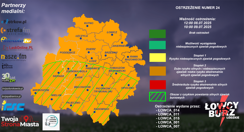 Grupa Łowcy Burz Łódzkie wydała ostrzeżenie 2. stopnia przed deszczem i burzą. Drugi stopień ostrzeżenia zostaje wydany dla wszystkich powiatów województwa łódzkiego, w tym dla powiatów: sieradzkiego, wieluńskiego i wieruszowskiego.