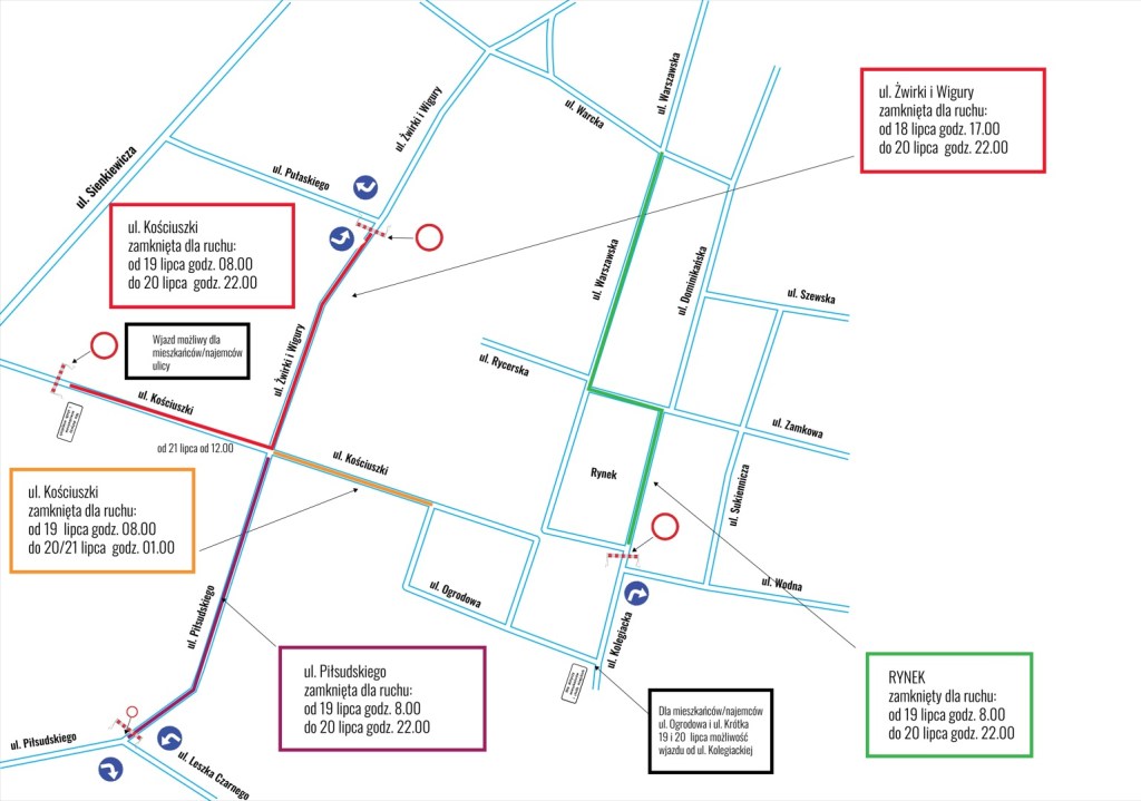 - ul. Kościuszki od skrzyżowania z ul. Piłsudskiego w stronę ul. Ogrodowej od 19.07 godz. 08.00 do 20/21.07 godz. 01.00