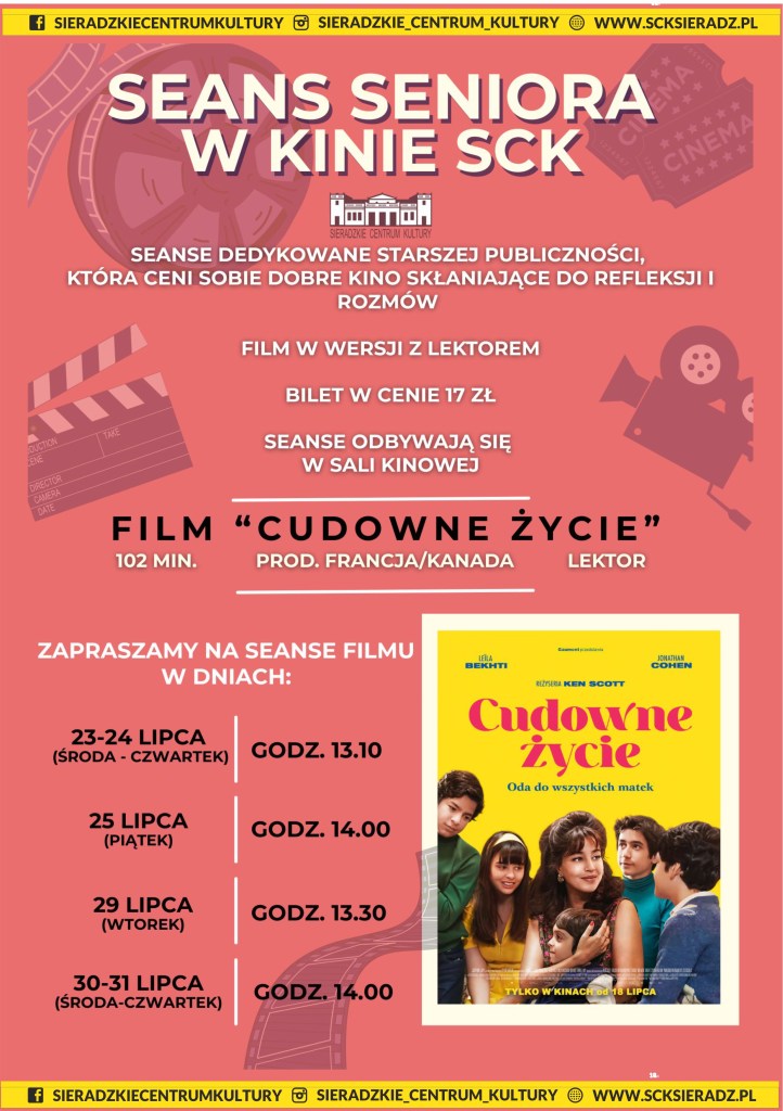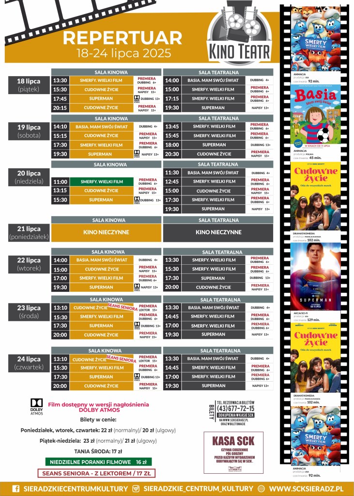Sieradzkie Centrum Kultury zaprezentowało repertuar kinowy KINO-TEATR SCK SIERADZ obowiązujący od 18 do 24 lipca. Oprócz filmów „Basia. Mam swój świat” i „Superman”, będą też dwie premiery – to filmy „Smerfy. Wielki film” i „Cudowne życie”. Dodatkowo będzie też cykl „Seans seniora w SCK”.