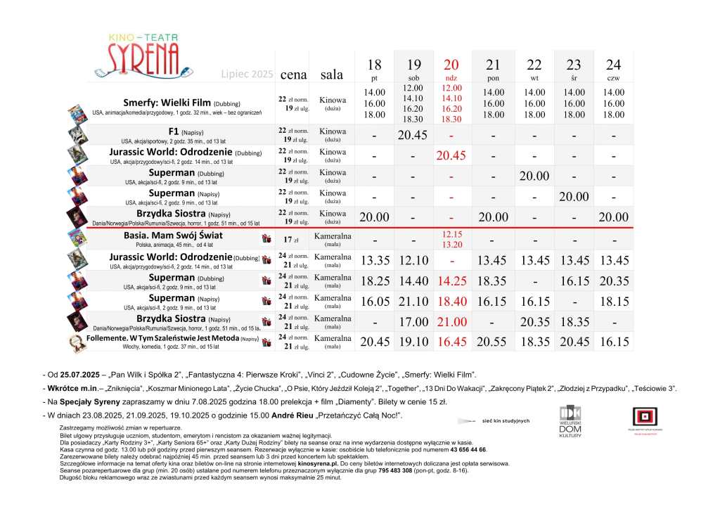 Kino Teatr „Syrena” w Wieluniu zaprasza na seanse filmowe. Na plakacie poniżej prezentujemy, co placówka przy ul. Narutowicza 2 zaprezentuje w dniach od 18 do 24 lipca. Bilety można zakupić TUTAJ.