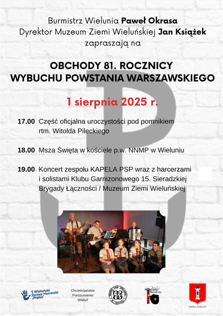 W programie pieśni z okresu Powstania, interpretacje klasyki polskich pieśni patriotycznych oraz oryginalne utwory “Kapeli PSP” dedykowane sylwetkom lokalnych Powstańców. Rozpoczęcie koncertu w Muzeum Ziemi Wieluńskiej w Wieluniu o godz. 19.00 dnia 1 sierpnia 2025 r. (piątek).