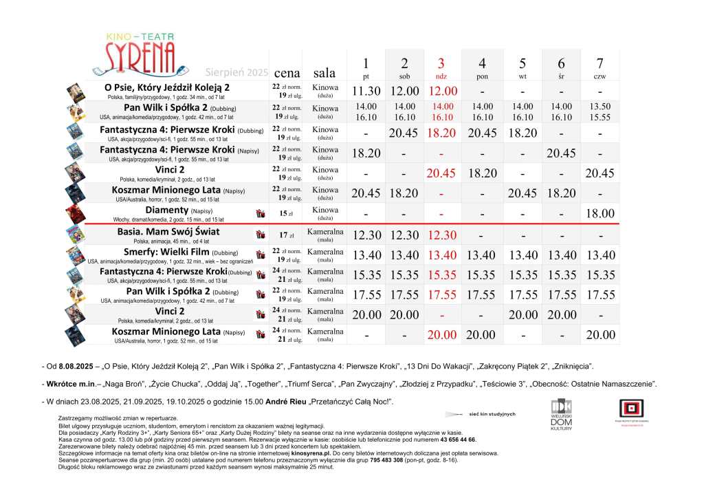 Kino Teatr „Syrena” w Wieluniu zaprasza na seanse filmowe. Na plakacie poniżej prezentujemy, co placówka przy ul. Narutowicza 2 zaprezentuje w dniach od 1 do 7 sierpnia. Bilety można zakupić TUTAJ.