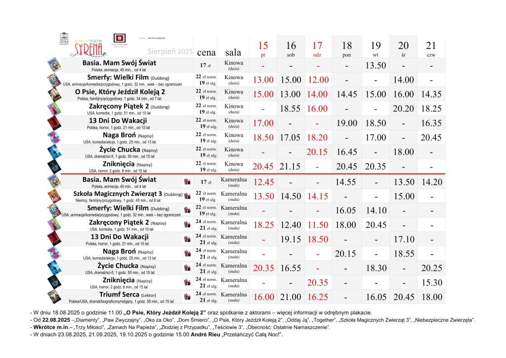 Kino Teatr „Syrena” w Wieluniu zaprasza na seanse filmowe. Na plakacie poniżej prezentujemy, co placówka przy ul. Narutowicza 2 zaprezentuje w dniach od 15 do 22 sierpnia. Bilety można zakupić TUTAJ.