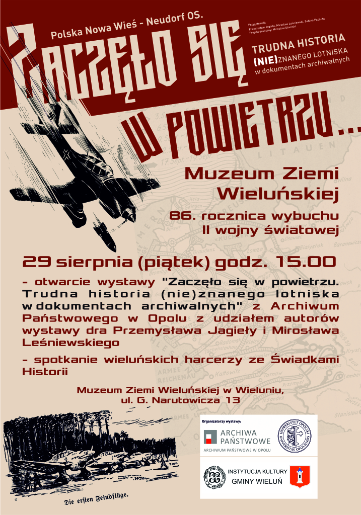29 sierpnia (piątek) o godz. 15.00 otwarta zostanie wystawa „Zaczęło się w powietrzu. Trudna historia (nie)znanego lotniska w dokumentach archiwalnych” z Archiwum Państwowego w Opolu oraz spotkanie wieluńskich harcerzy ze Świadkami Historii.