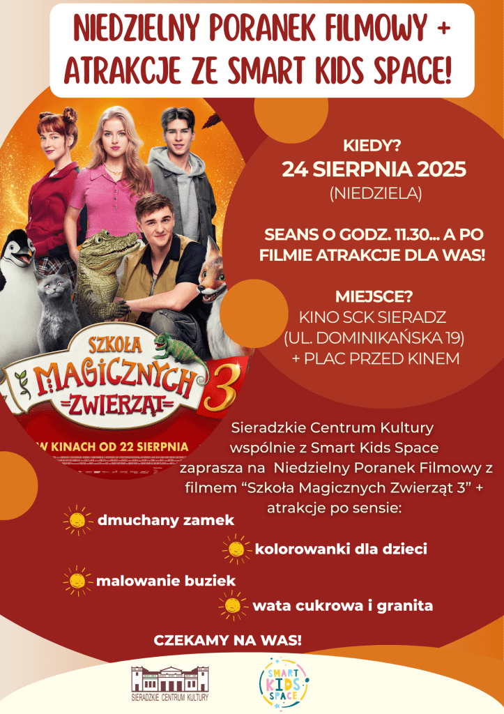 Sieradzkie Centrum Kultury razem ze Smart Kids Space zaprasza na Niedzielny Poranek Filmowy z filmem „SZKOŁA MAGICZNYCH ZWIERZĄT 3”, a po filmie… na miejscu czeka na Was niezapomniana atrakcja! Smart Kids Space rozkręci zabawę. Będzie m.in. dmuchany zamek, malowanie buziek, wata cukrowa, kolorowanki dla dzieci i inne.
