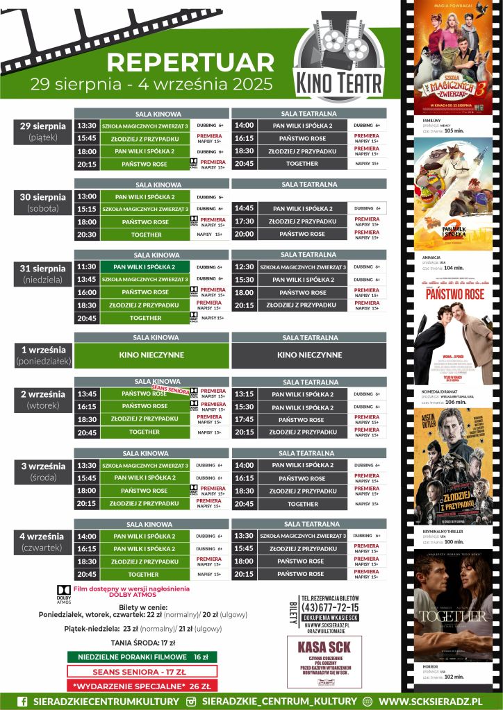 Sieradzkie Centrum Kultury zaprezentowało repertuar kinowy KINO-TEATR SCK SIERADZ obowiązujący od 29 sierpnia do 4 września. Oprócz filmów „Pan wilk i spółka 2”, „Together” i „Szkoła magicznych zwierząt 3”, będą też dwie premiery: „Państwo Rose” i „Złodziej z przypadku”.