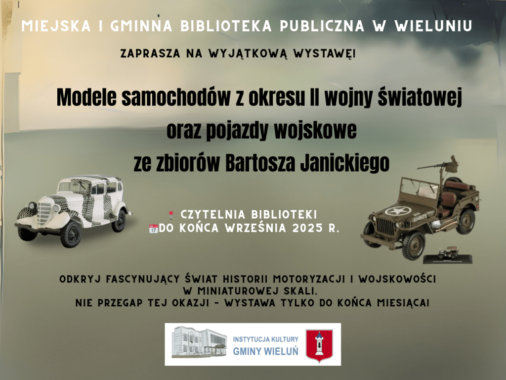 Dobra informacja dla miłośników modeli samochodów z okresu II Wojny Światowej. Wystawa tych pojazdów w Miejskiej i Gminnej Bibliotece Publicznej w Wieluniu potrwa do końca września.