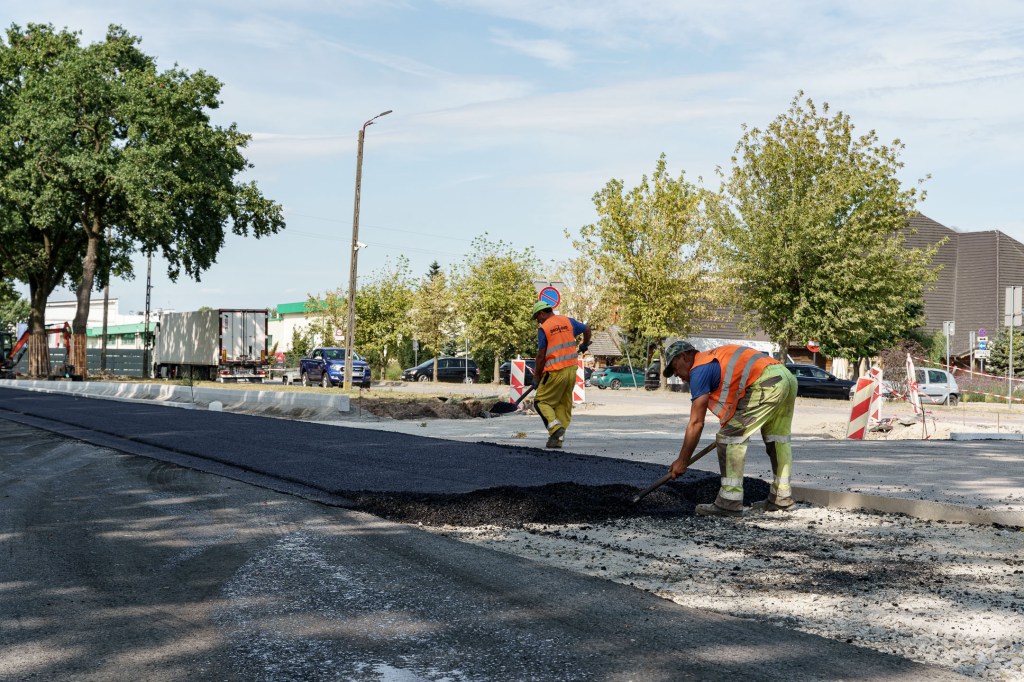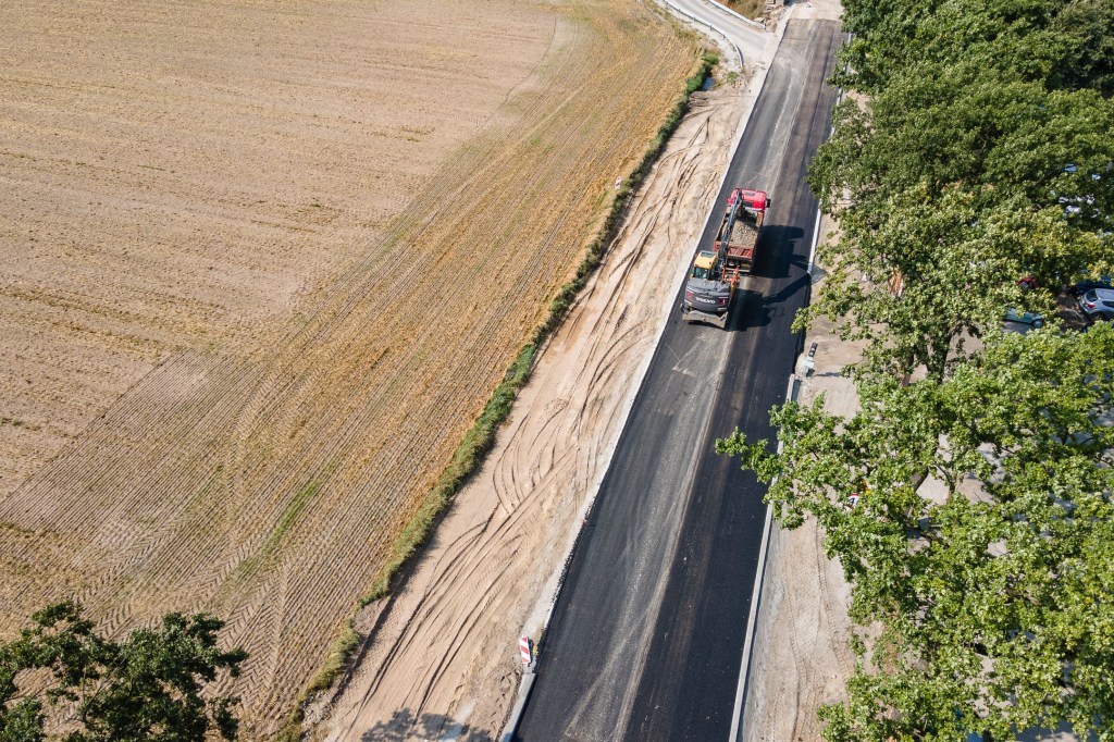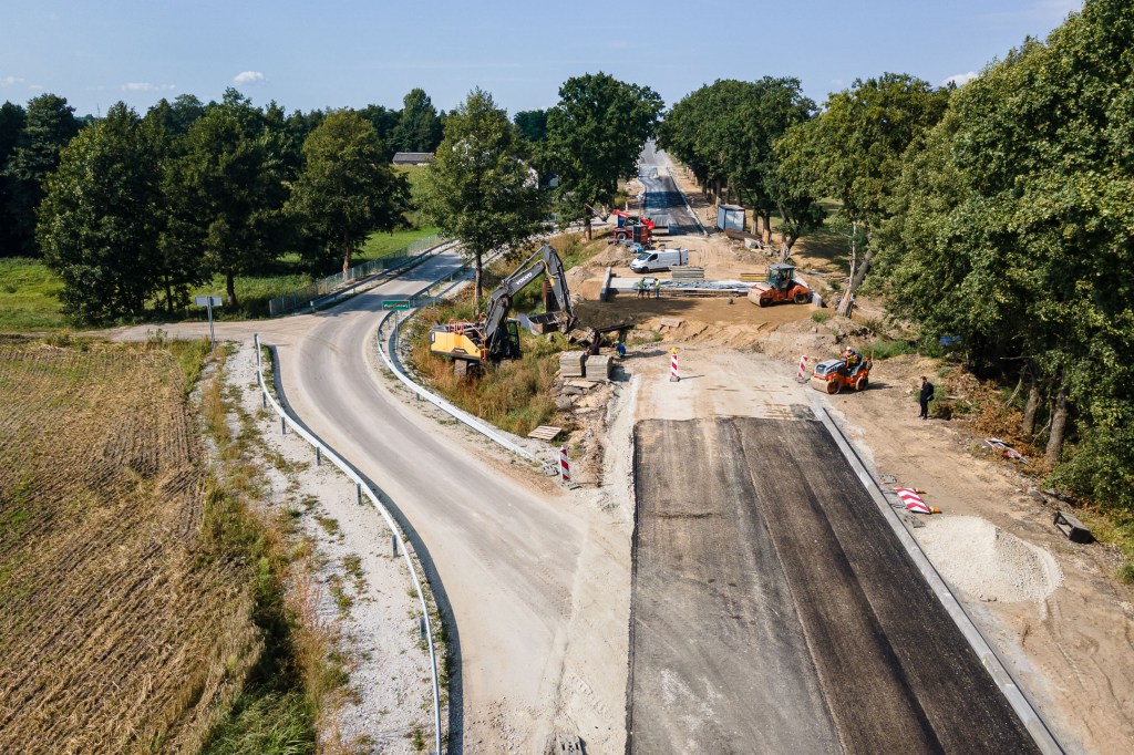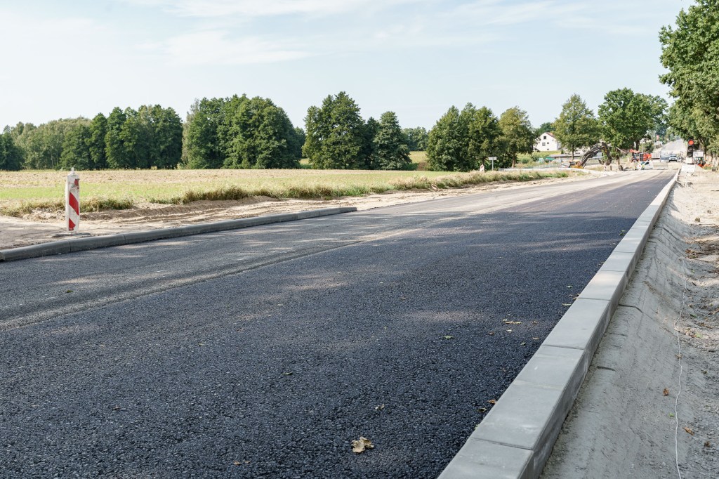 Nowy przepust jest już w dużej mierze gotowy – ułożono pierwsze warstwy asfaltu na dojazdach, wykonano zasadniczą bryłę obiektu i rozpoczęto prace łączące go z istniejącą drogą. Równolegle trwają roboty brukarskie, w tym budowa chodnika i zatok autobusowych.