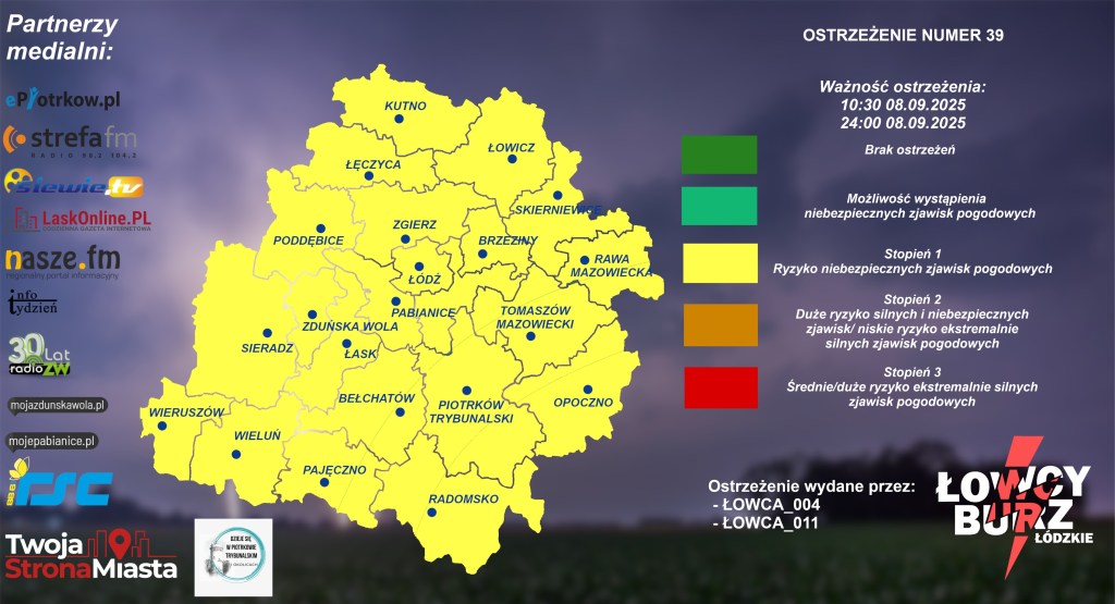 Grupa Łowcy Burz Łódzkie wydała ostrzeżenie 1. stopnia przed burzą. Obowiązuje ono na terenie całego województwa łódzkiego, w tym dla powiatów: sieradzkiego, wieluńskiego i wieruszowskiego.