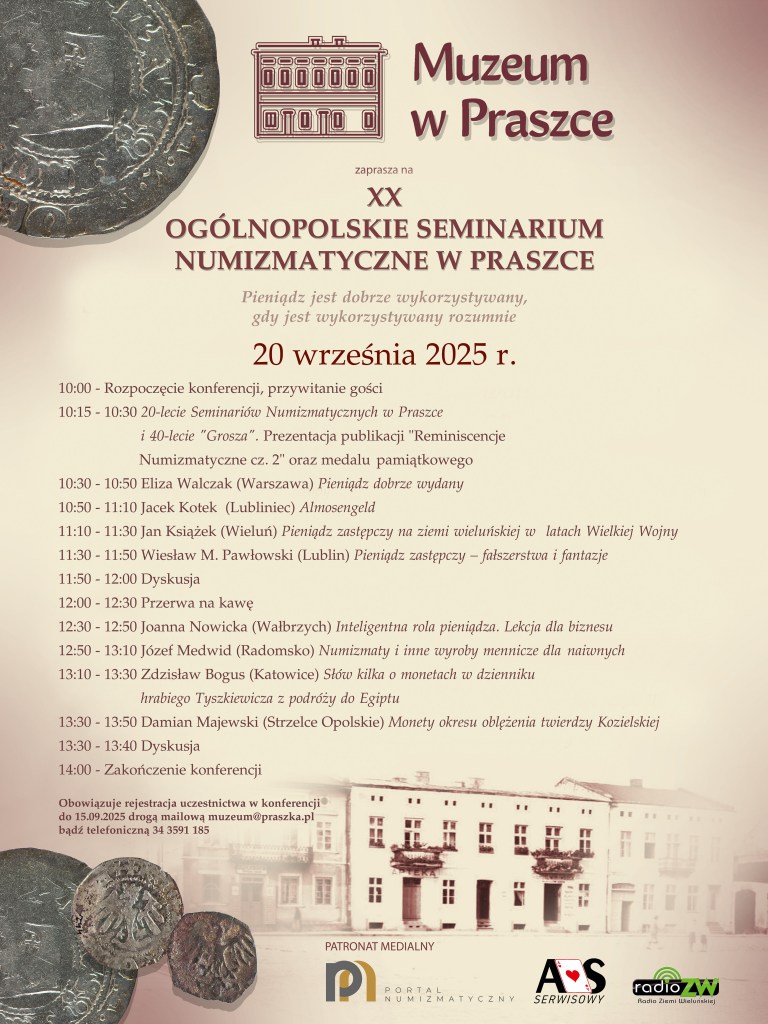 Muzeum w Praszce zaprasza na XX Seminarium Numizmatyczne. Program wydarzenia dostępny jest poniżej.