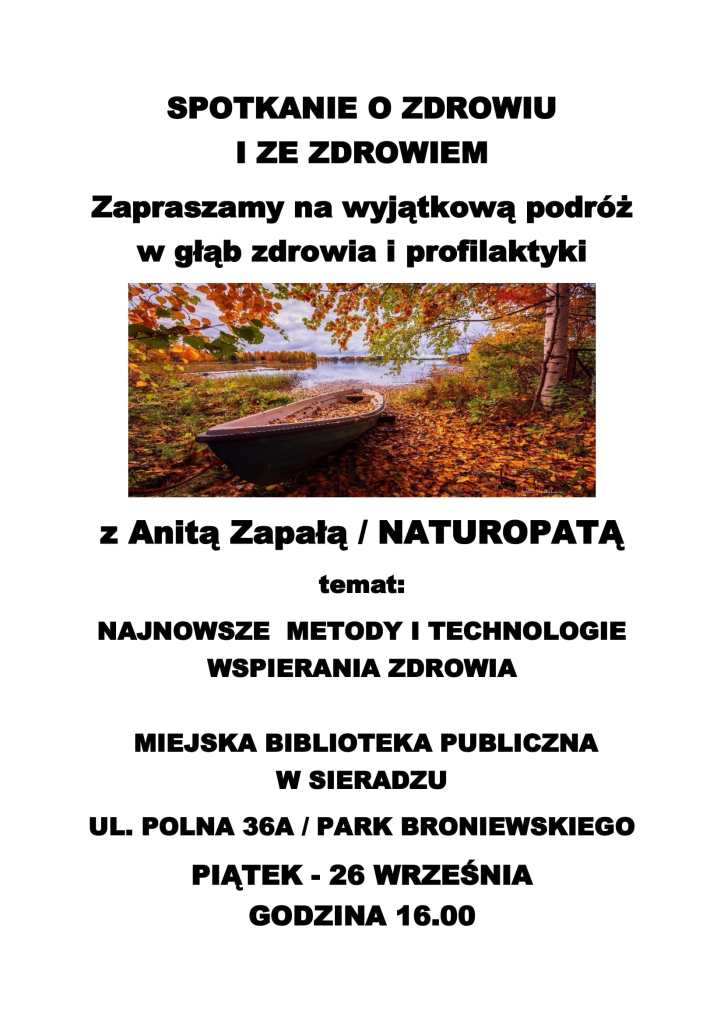 W Miejskiej Bibliotece Publicznej w Sieradzu (ul. Polna 36A/Park Broniewskiego), odbędzie się spotkanie z naturopatą Anitą Zapałą. Spotkanie będzie poświęcone zdrowiu i profilaktyce.