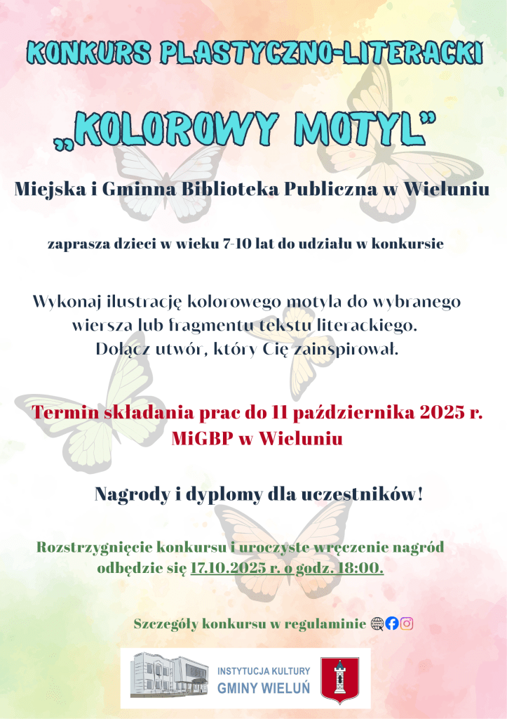 Miejska i Gminna Biblioteka Publiczna w Wieluniu zachęca dzieci w wieku od 7 do 10 lat z terenu gminy Wieluń do udziału w konkursie plastyczno-literackim „Kolorowy Motyl”.