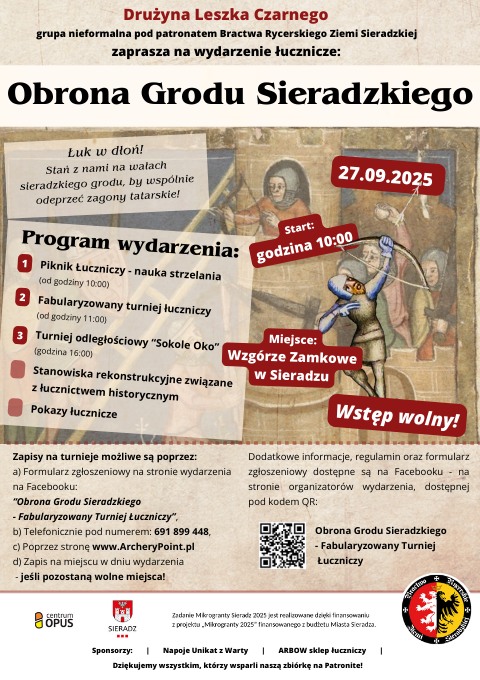 W sobotę 27 września o godz. 10:00 na Wzgórzu Zamkowym w Sieradzu, odbędzie się II Turniej Łuczniczy. Organizatorem wydarzenia jest grupa nieformalna „Drużyna Leszka Czarnego” pod patronatem Bractwa Rycerskiego Ziemi Sieradzkiej.