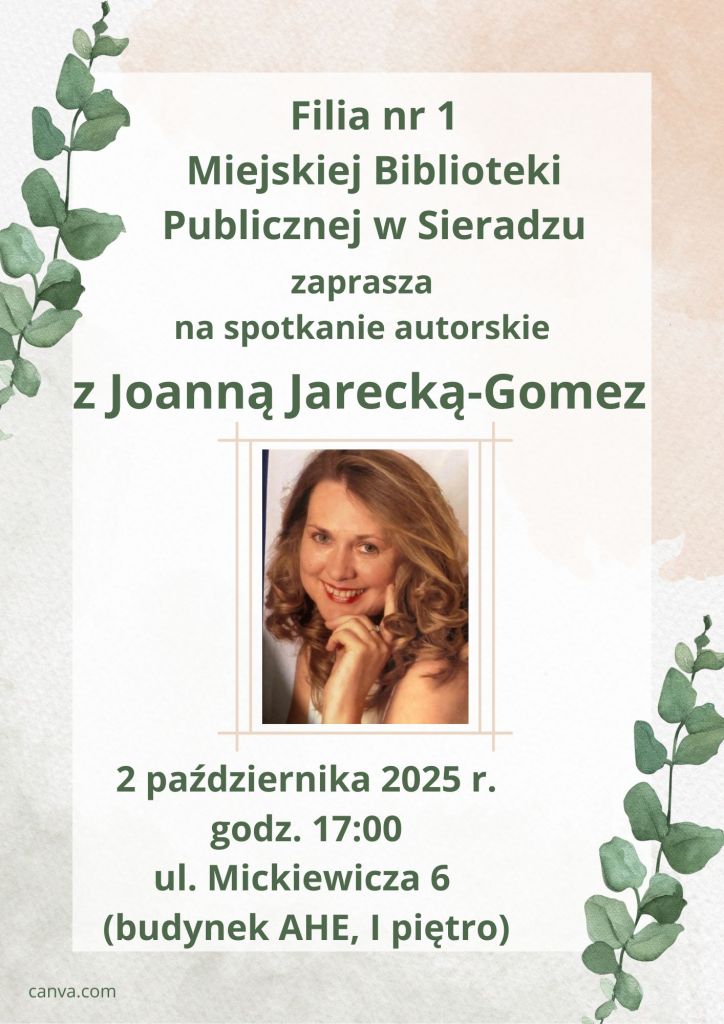 Filia nr 1 MBP w Sieradzu zaprasza na spotkanie autorskie Joanną Jarecką-Gomez, które odbędzie się 2 października o godz. 17:00. Miejsce spotkania: ul. Mickiewicza 6 (budynek AHE, I piętro).