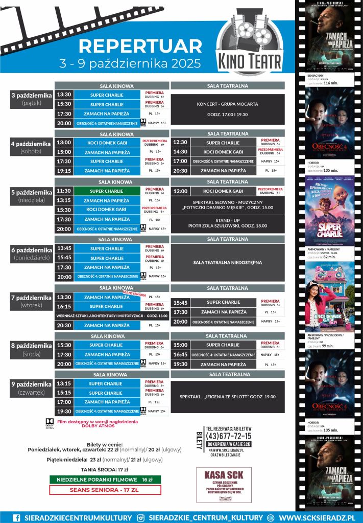 Sieradzkie Centrum Kultury zaprezentowało repertuar kinowy KINO-TEATR SCK SIERADZ obowiązujący od 3 do 9 października. Oprócz filmów „Zamach na papieża” i „Obecność 4: Ostatnie namaszczenie”, będą też dwie premiery – to filmy „Super Charlie” i „Koci domek Gabi: Film”. Dodatkowo można też kupić bilety na retransmisję koncertu Andre Rieu „Przetańczyć całą noc!”.