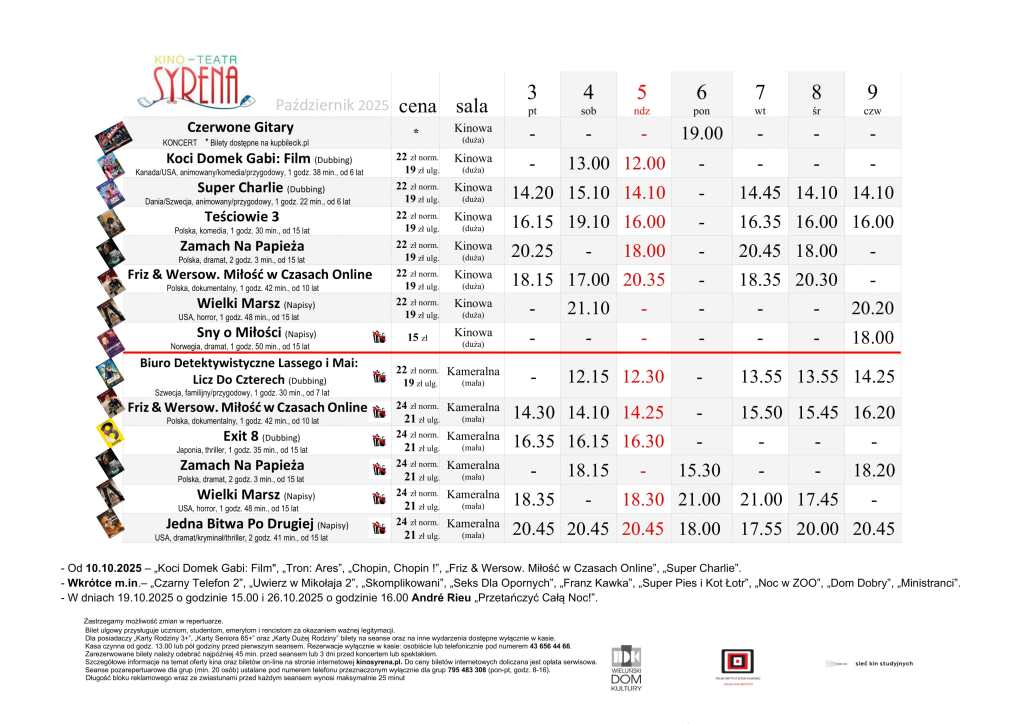 Kino Teatr „Syrena” w Wieluniu zaprasza na seanse filmowe. Na plakacie poniżej prezentujemy, co placówka przy ul. Narutowicza 2 zaprezentuje w dniach od 3 do 9 października. Bilety można zakupić TUTAJ.