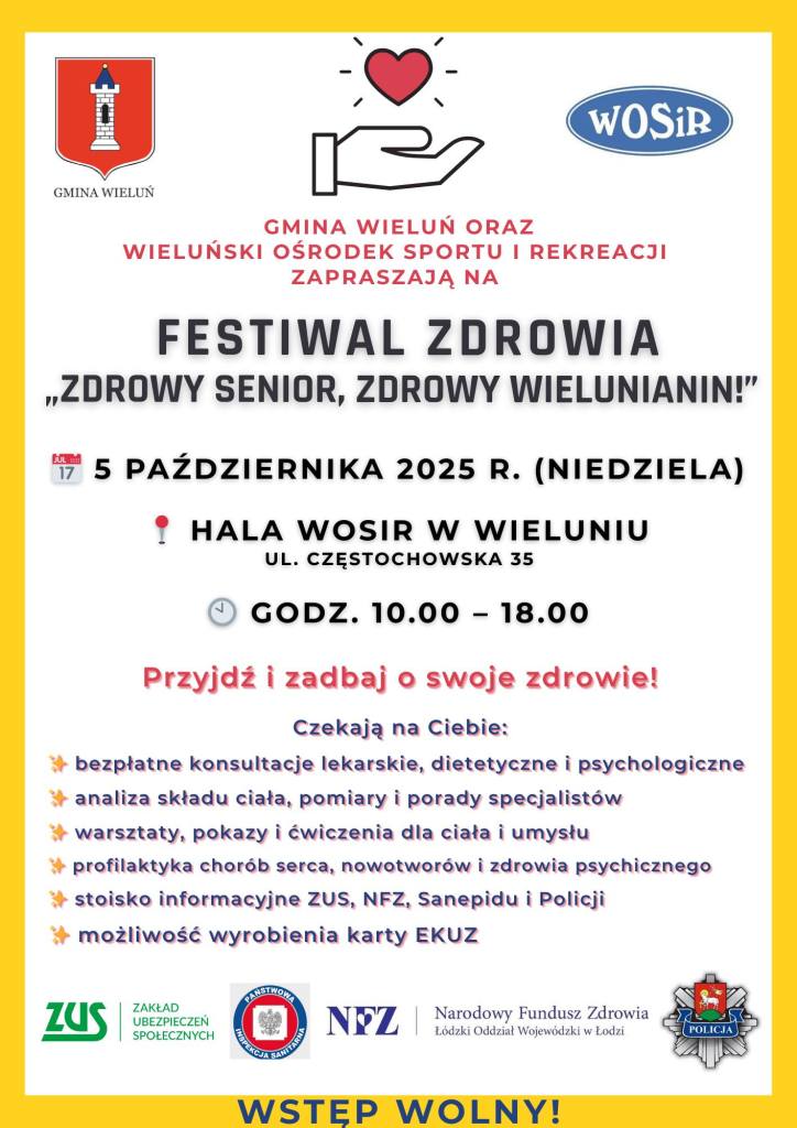W najbliższą niedzielę w hali WOSiR w Wieluniu odbędzie się festiwal zdrowia „Zdrowy Senior, Zdrowy Wielunianin!”. To wydarzenie poświęcone zdrowiu i profilaktyce!