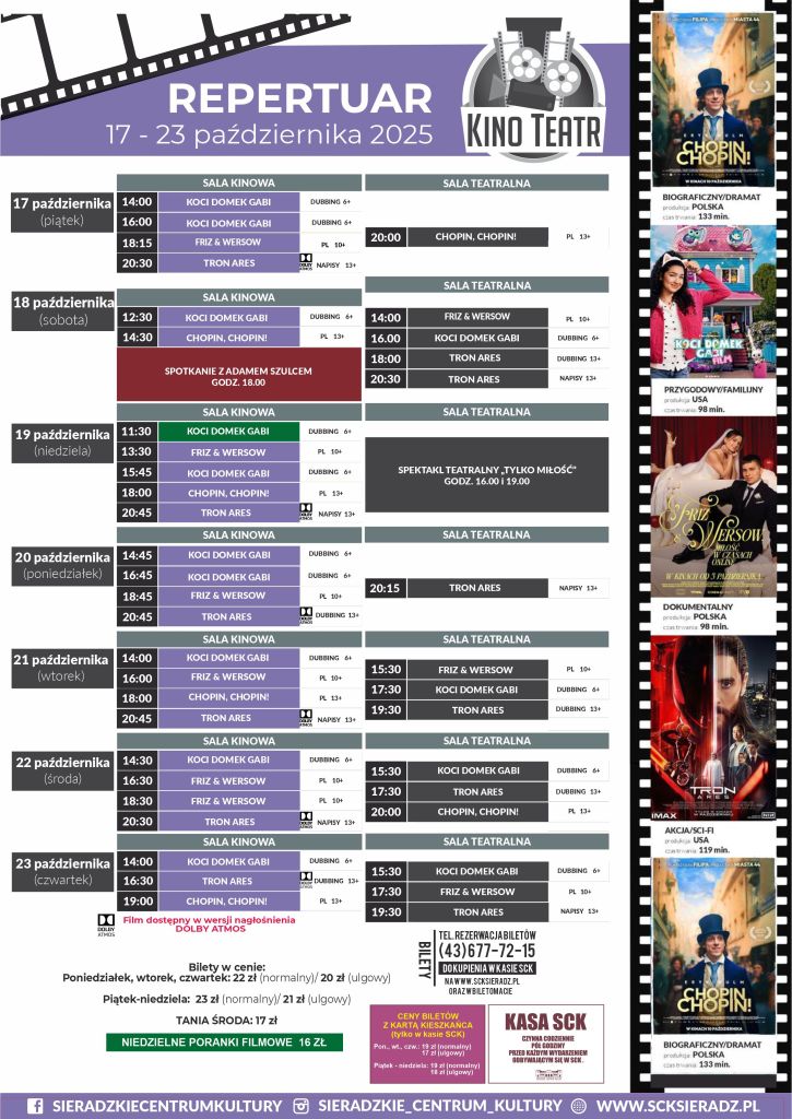 Sieradzkie Centrum Kultury zaprezentowało repertuar kinowy KINO-TEATR SCK SIERADZ obowiązujący od 17 do 23 października. Pokazane zostaną filmy: „Koci domek Gabi: Film”, „Chopin, Chopin!”, „Tron: Ares” oraz „Friz & Wersow. Miłość w czasach online”.