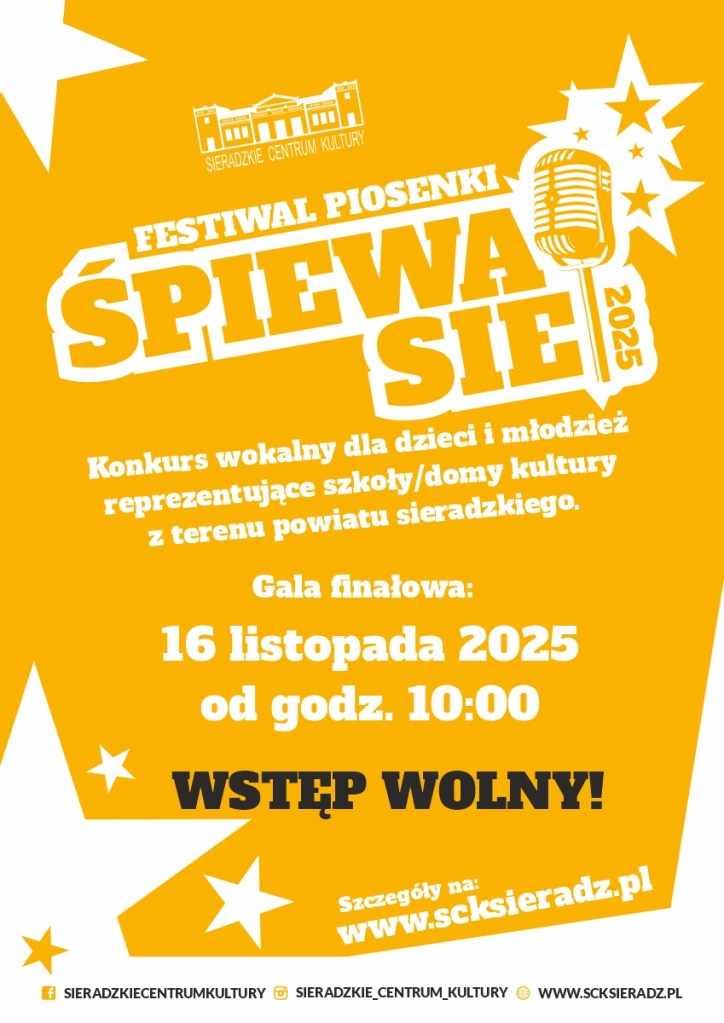 „ŚPIEWASIE” to konkurs wokalny dla dzieci i młodzieży reprezentujących szkoły/domy kultury z terenu powiatu sieradzkiego. Gala finałowa odbędzie się 16 listopada (niedziela) od godziny 10:00. Organizatorem festiwalu jest Sieradzkie Centrum Kultury.