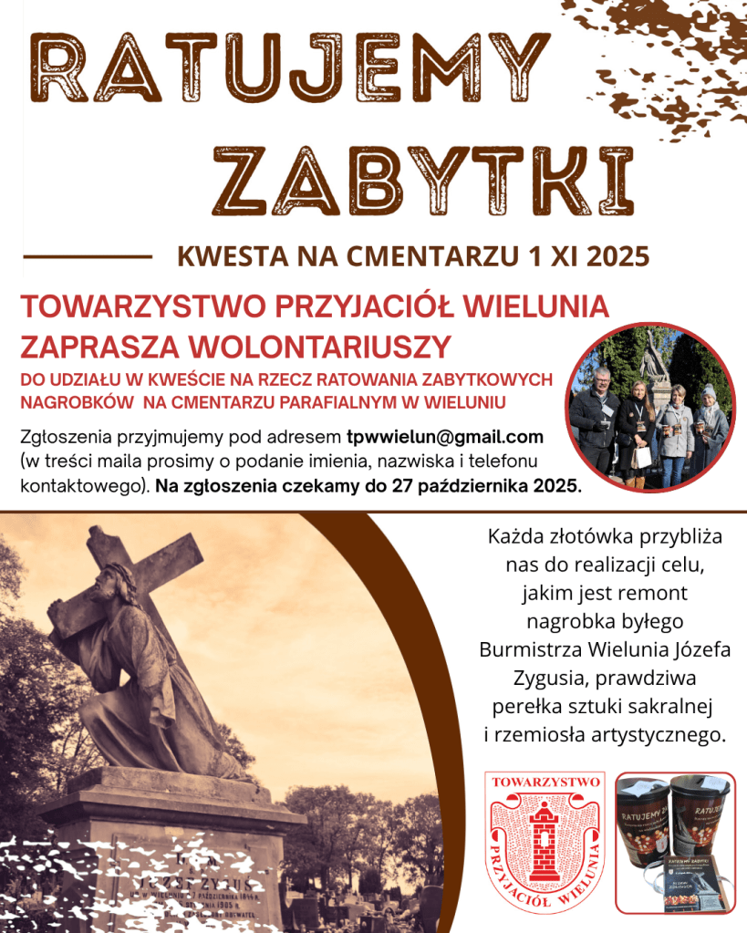 Już po raz drugi, 1 listopada Towarzystwo Przyjaciół Wielunia przeprowadzi kwestę na rzecz ratowania zabytkowych nagrobków na wieluńskim cmentarzu. Każdy będzie mógł wesprzeć tę inicjatywę wrzucając datek do puszki lub poświęcając godzinę, by kwestować jako wolontariusz (szczegóły na plakacie). Ponieważ koszt remontu przekracza wysokość zebranych w ubiegłym roku środków, dalej zbierane będą środki na pomnik Józefa Zygusia.