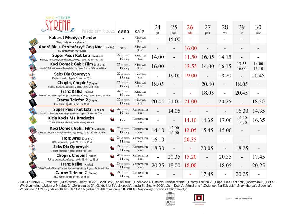 Kino Teatr „Syrena” w Wieluniu zaprasza na seanse filmowe. Na plakacie poniżej prezentujemy, co placówka przy ul. Narutowicza 2 zaprezentuje w dniach od 24 do 30 października. Bilety można zakupić TUTAJ.