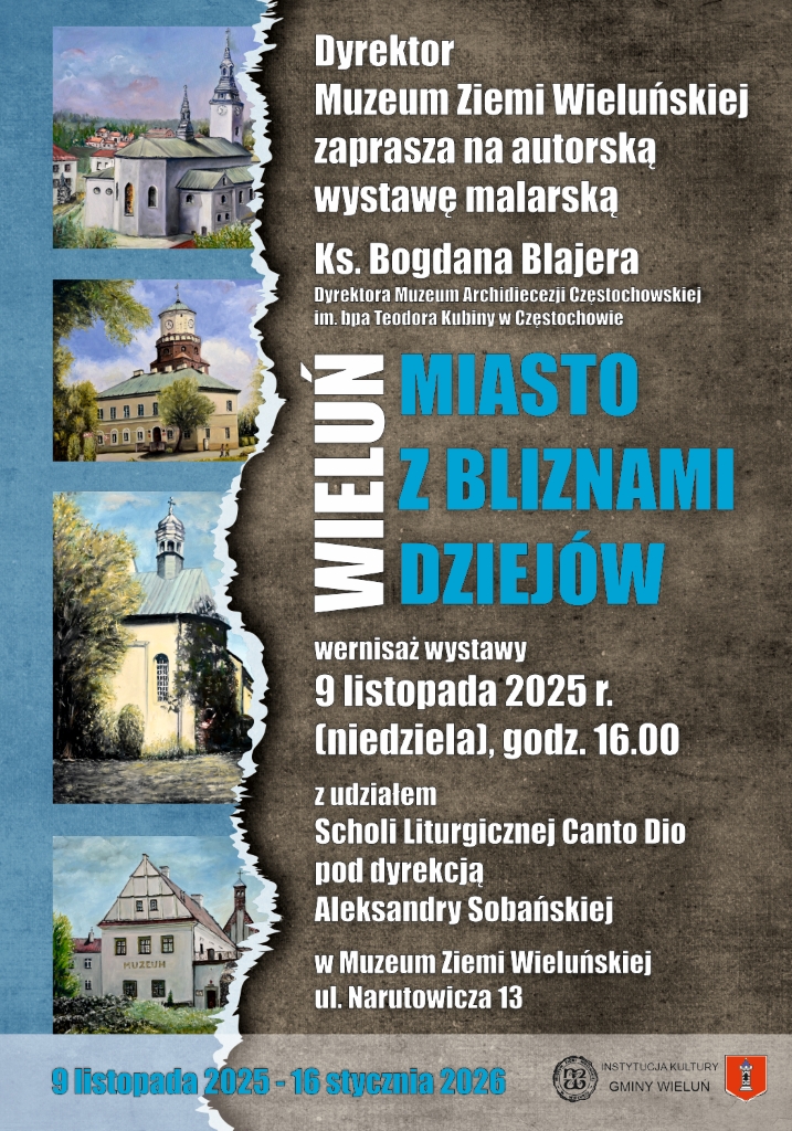 9 listopada o godz. 16:00 odbędzie się wernisaż autorskiej wystawy malarskiej ks. Bogdana Blajera „Wieluń. Miasto z bliznami dziejów”. Wydarzeniu towarzyszył będzie koncert Scholi Liturgicznej Canto Dio pod dyrekcją Aleksandry Sobańskiej.