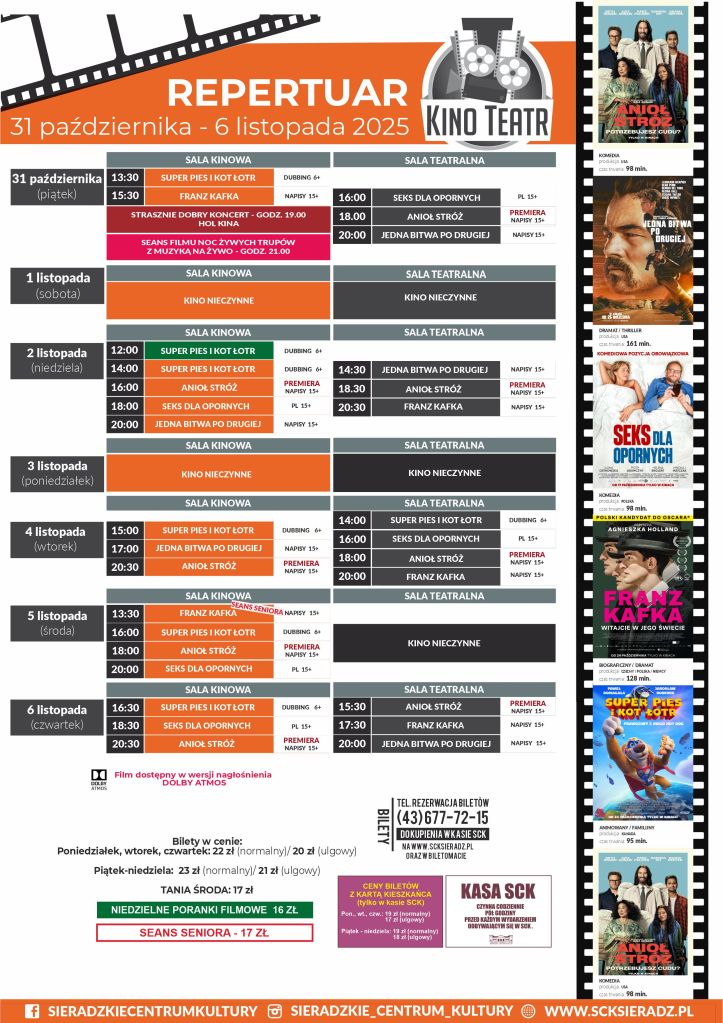 Sieradzkie Centrum Kultury zaprezentowało repertuar kinowy KINO-TEATR SCK SIERADZ obowiązujący od 31 października do 6 listopada. Pokazane zostaną filmy: „Jedna bitwa po drugiej”, „Super pies i kot łotr”, „Franz Kafka” i „Seks dla opornych”. Będzie też jedna premiera – to film: „Anioł stróż”.