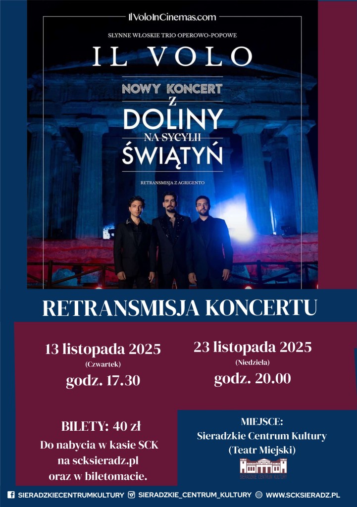 Sieradzkie Centrum Kultury zaprasza na retransmisję letniego show z Agrigento na Sycylii 2024, zatytułowanego „IL Volo. Najnowszy koncert z Doliny Świątyń”, który odbędzie się w Teatrze Miejskim w dwóch terminach: 13 listopada (czwartek) o godz. 17:30 i 23 listopada (niedziela) o godz. 20:00.