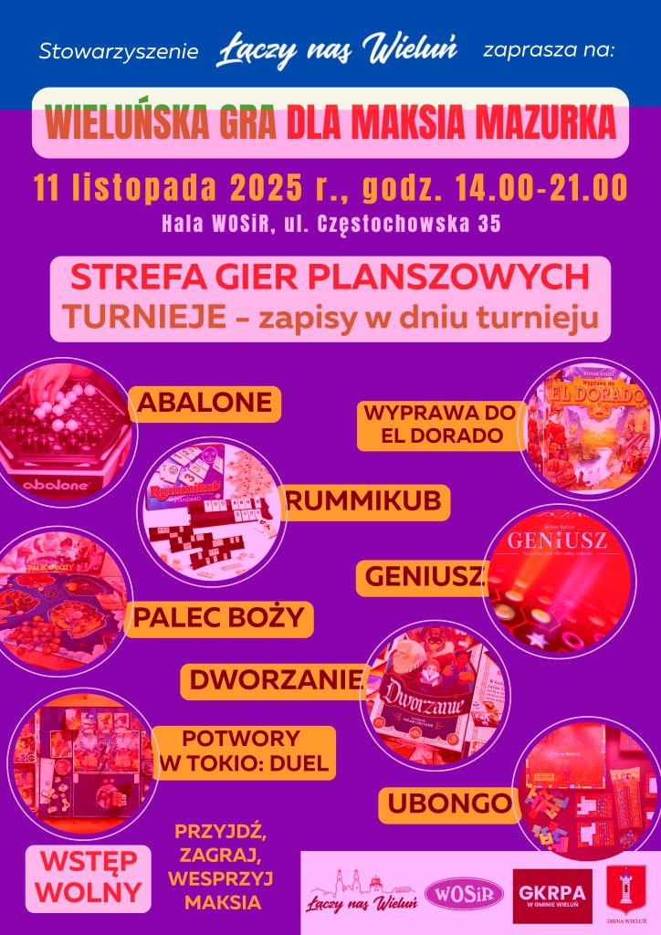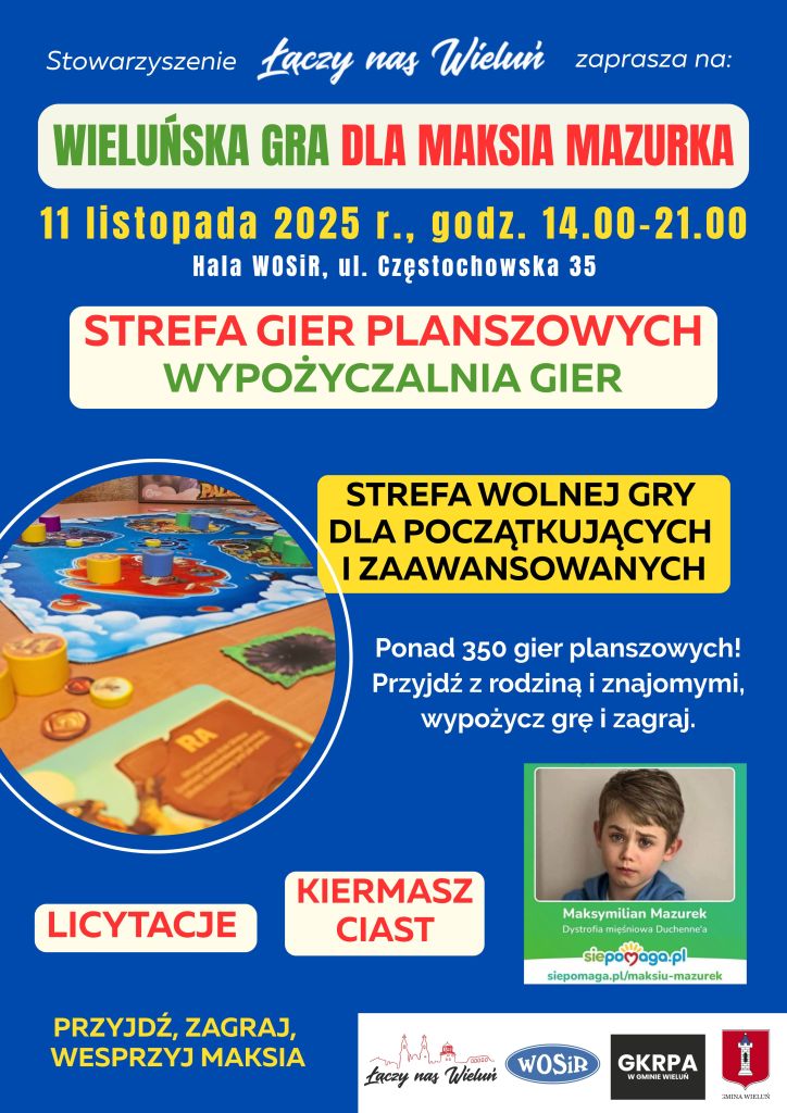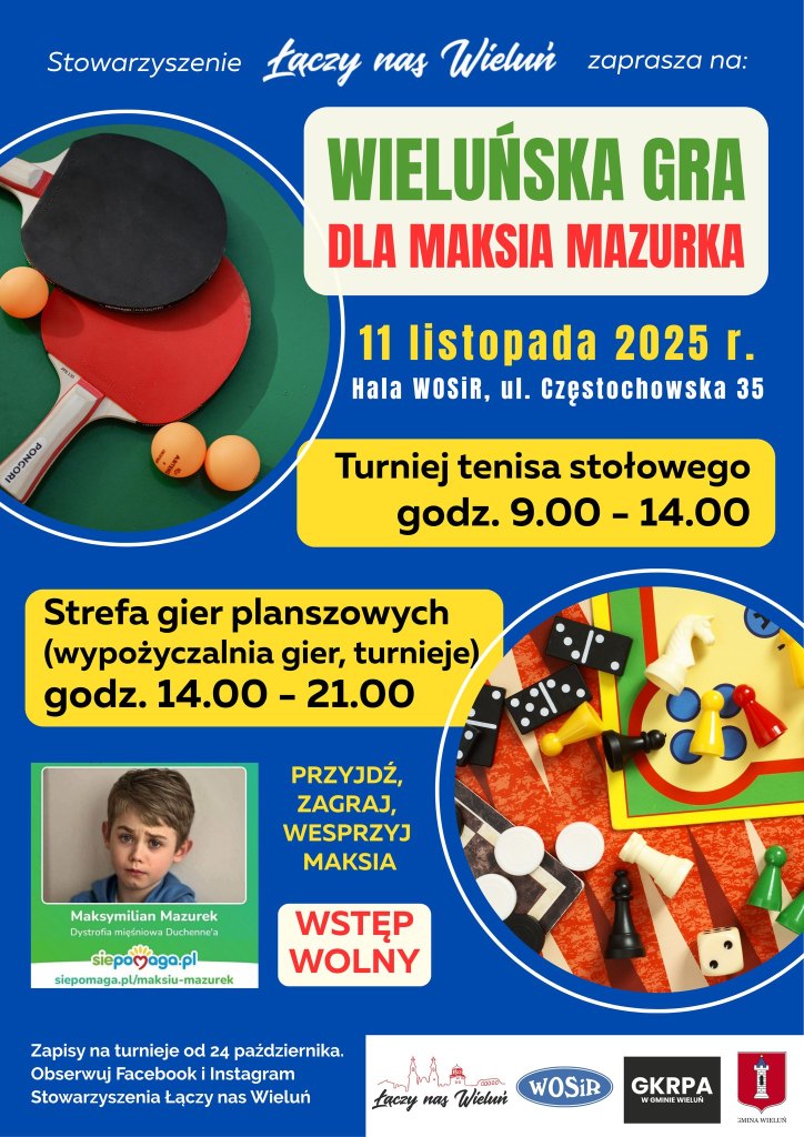 Stowarzyszenie „Łączy nas Wieluń” zaprasza na wydarzenie, które odbędzie się we wtorek 11 listopada na hali Wieluńskiego Ośrodka Sportu i Rekreacji przy ul. Częstochowskiej 35. „Wieluńska Gra dla Maksia Mazurka” to doskonała okazja, aby połączyć przyjemne z pożytecznym i wesprzeć Maksia Mazurka!