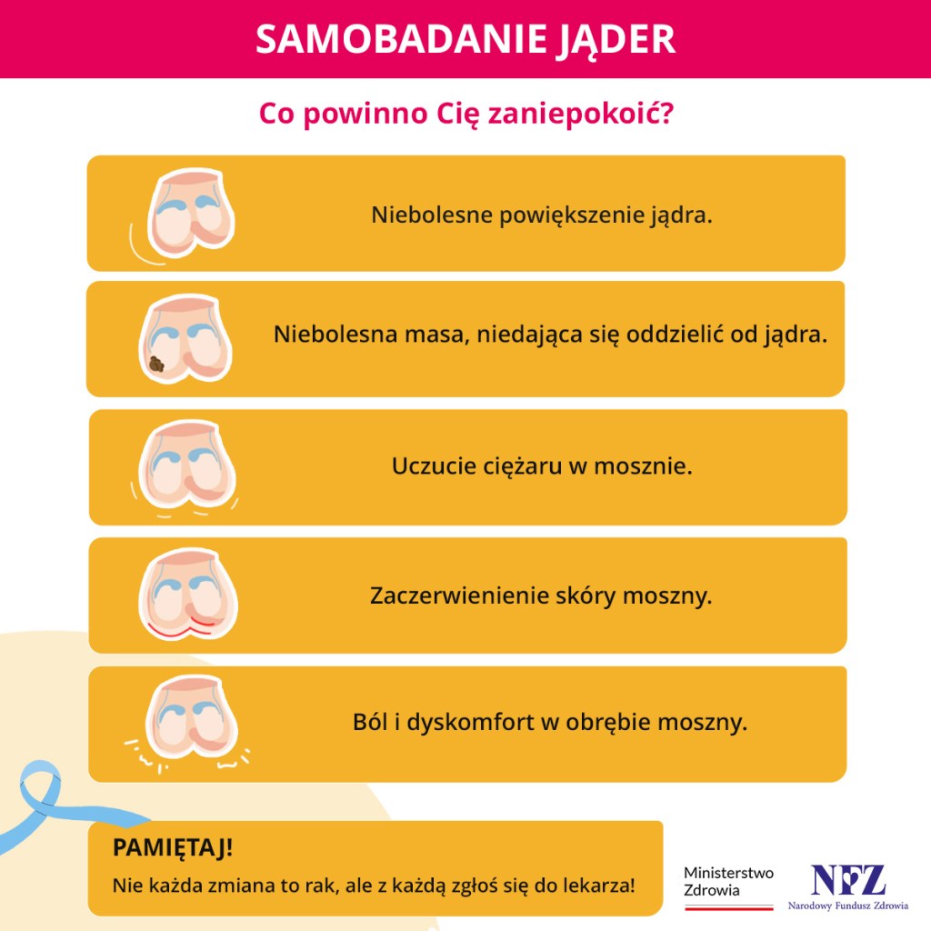 - W każdym wieku pamiętaj o regularnym samobadaniu jąder raz w miesiącu. Na raka jądra najczęściej chorują młodzi mężczyźni w wieku 14 – 35 lat. W 95 proc. przypadków rak może być całkowicie wyleczalny. Warunkiem jest jego wczesne wykrycie.