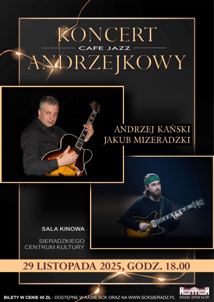 Sieradzkie Centrum Kultury zaprasza na koncert andrzejowy „Cafe Jazz” w wykonaniu duetu Jakub Mizeracki & Andrzej Kański, który odbędzie się 29 listopada (sobota) o godz. 18:00 w sali kinowej SCK-u. Bilety w cenie 40 zł.
