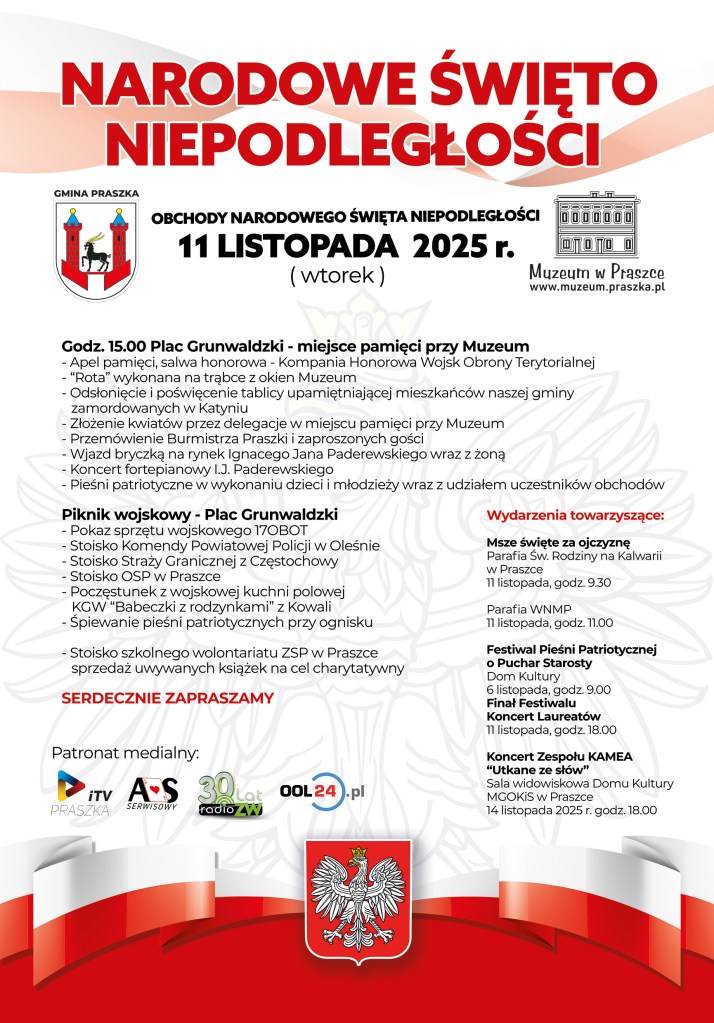Gmina Praszka oraz Muzeum w Praszce zapraszają na obchody Narodowego Święta Niepodległości. Centralnym miejscem obchodów będzie Plac Grunwaldzki. Uroczystościom towarzyszyć będzie piknik wojskowy. Więcej szczegółów na plakacie poniżej.