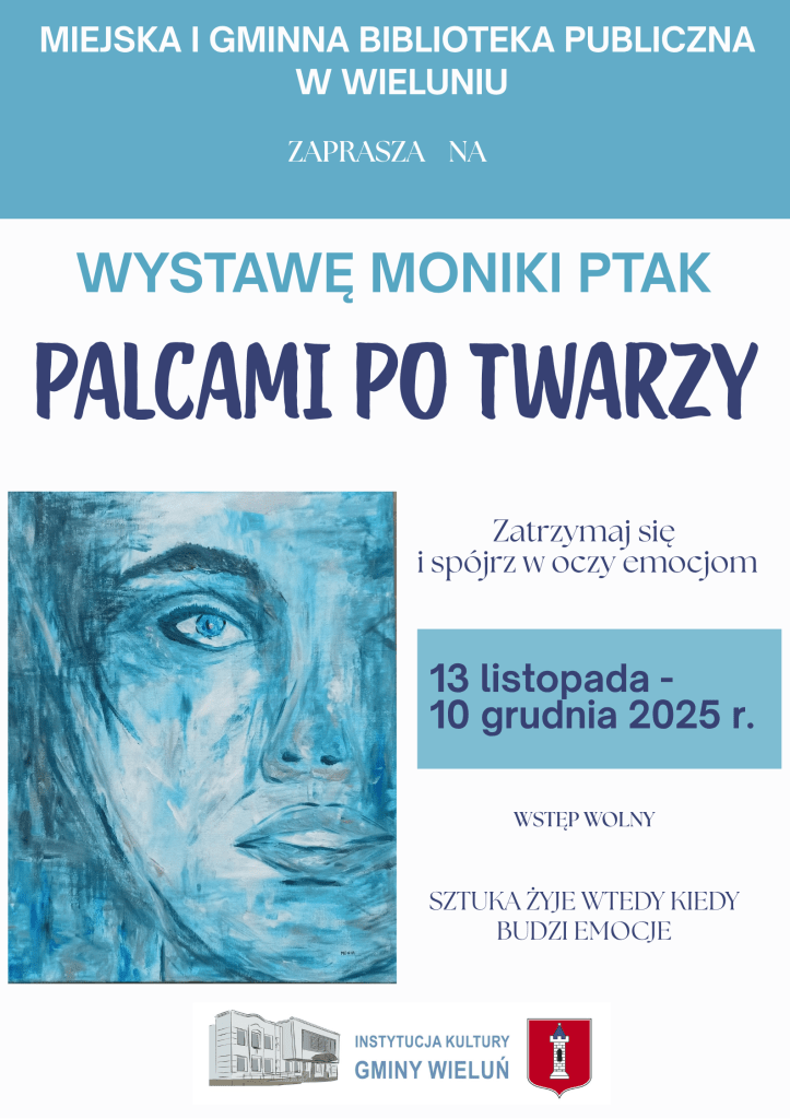 Miejska i Gminna Biblioteka Publiczna w Wieluniu zaprasza na wystawę Moniki Ptak „Palcami po twarzy” – to poruszające malarstwo tworzone palcami, pełne emocji i kobiecych portretów – przyznają organizatorzy.