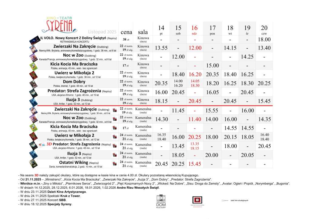Kino Teatr „Syrena” w Wieluniu zaprasza na seanse filmowe. Na plakacie poniżej prezentujemy, co placówka przy ul. Narutowicza 2 zaprezentuje w dniach od 14 do 20 listopada. Bilety można zakupić TUTAJ.
