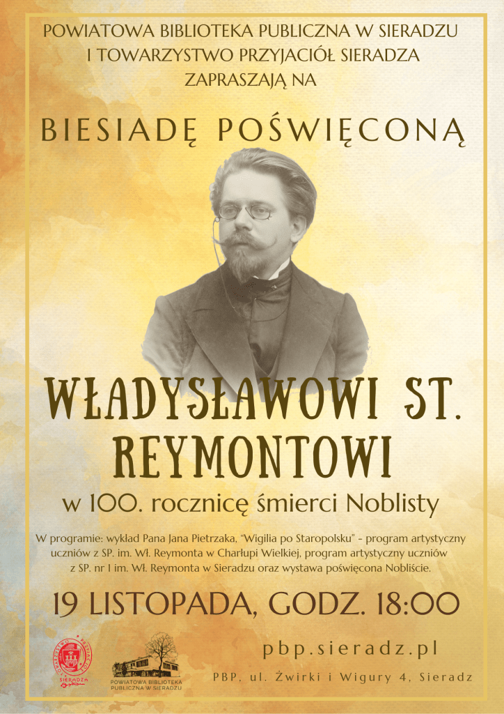Powiatowa Biblioteka Publiczna w Sieradzu oraz Towarzystwo Przyjaciół Sieradza serdecznie zapraszają na spotkanie poświęcone 100. rocznicy śmierci laureata Nagrody Nobla – Władysława Stanisława Reymonta.