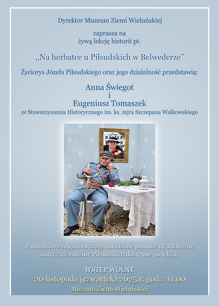 Żywa lekcja historii w Muzeum Ziemi Wieluńskiej. W czwartek 20 listopada, odbędzie się spotkanie zatytułowane „Na herbatce u Piłsudskich w Belwederze”. Więcej szczegółów na plakacie poniżej.