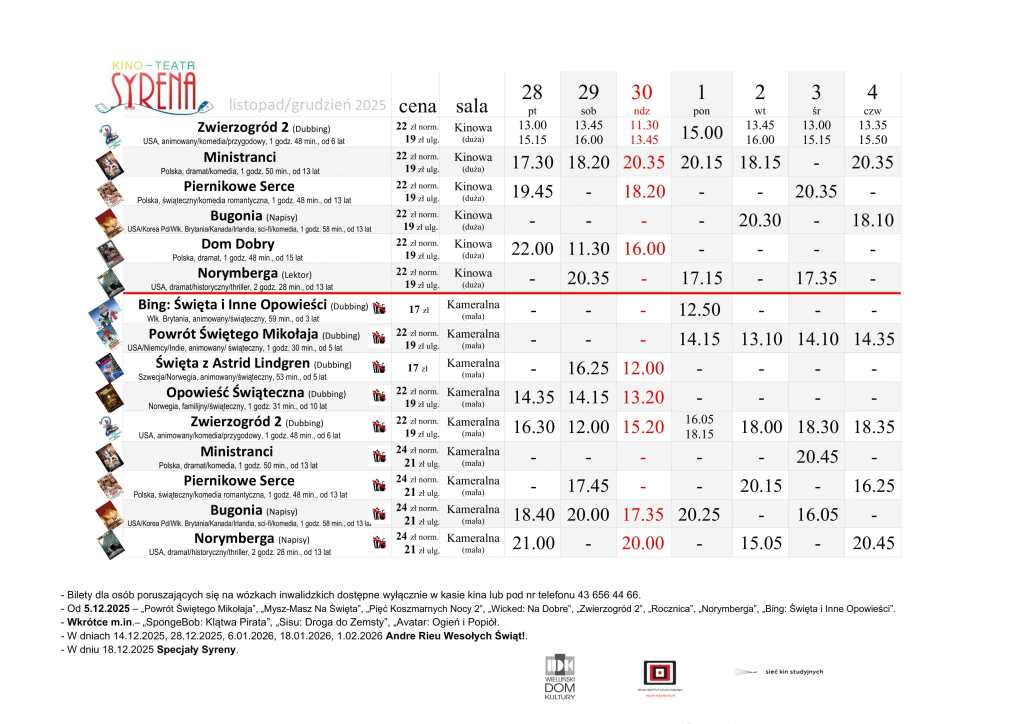 Kino Teatr „Syrena” w Wieluniu zaprasza na seanse filmowe. Na plakacie poniżej prezentujemy, co placówka przy ul. Narutowicza 2 zaprezentuje w dniach od 28 listopada do 4 grudnia. Bilety można zakupić TUTAJ.