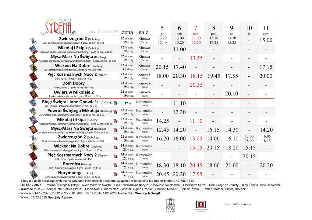 Kino Teatr „Syrena” w Wieluniu zaprasza na seanse filmowe. Na plakacie poniżej prezentujemy, co placówka przy ul. Narutowicza 2 zaprezentuje w dniach od 5 do 11 grudnia. Bilety można zakupić TUTAJ.