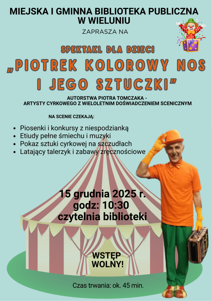 Miejska i Gminna Biblioteka Publiczna w Wieluniu zaprasza na spektakl dla dzieci zatytułowany „Piotrek – kolorowy nos i jego sztuczki”. Więcej szczegółów na plakacie poniżej.