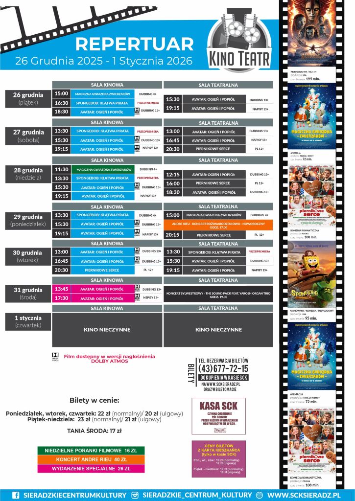 Sieradzkie Centrum Kultury zaprezentowało repertuar kinowy KINO-TEATR SCK SIERADZ obowiązujący od 26 grudnia 2025 roku do Nowego Roku, 1 stycznia 2026 roku. Oprócz filmów: „Magiczna gwiazdka zwierzaków” i „Piernikowe serce” i „Avatar: Ogień i popiół”, będzie też jedna przedpremiera – to film: „Spongebob. Klątwa pirata”. W ramach repertuaru, pokazana będzie również retransmisja koncertu Andre Rieu „Wesołych Świąt”.