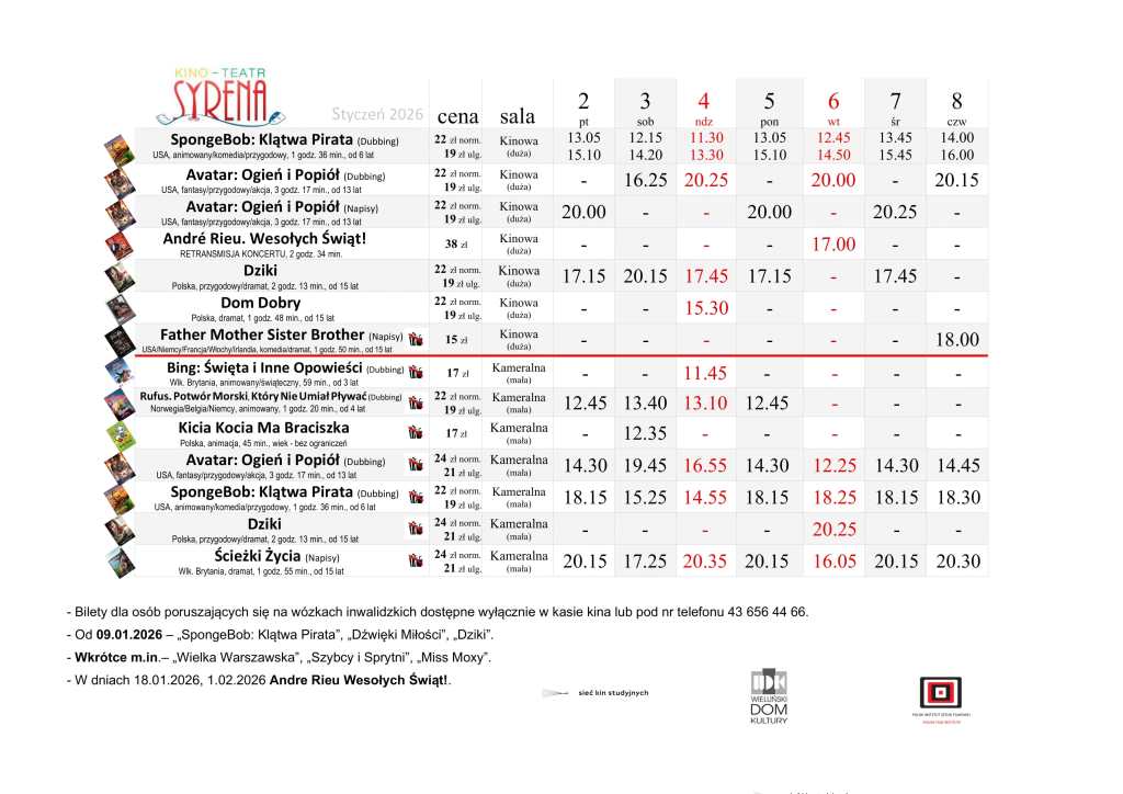Kino Teatr „Syrena” w Wieluniu zaprasza na seanse filmowe. Na plakacie poniżej prezentujemy, co placówka przy ul. Narutowicza 2 puści w dniach od 2 do 8 stycznia. Bilety można zakupić TUTAJ.