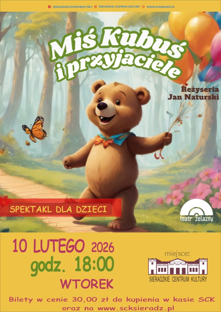 Sieradzkie Centrum Kultury zaprasza na spektakl dla dzieci „Miś Kubuś i przyjaciele”, który odbędzie się 10 lutego (wtorek) o godz. 18:00 w Teatrze Miejskim.
