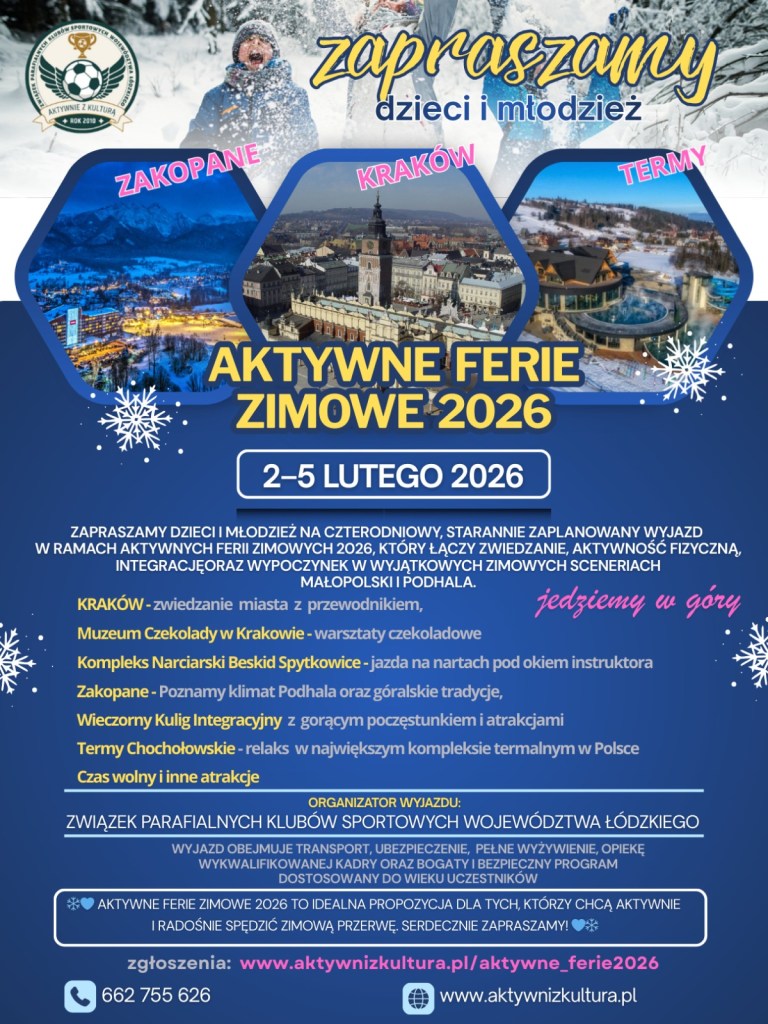 Związek Parafialnych Klubów Sportowych Województwa Łódzkiego zaprasza dzieci i młodzież do udziału w wyjątkowym wyjeździe Aktywne Ferie Zimowe 2026, który odbędzie się w dniach 2–5 lutego 2026 i połączy aktywny wypoczynek, zwiedzanie oraz integrację w niezwykłej zimowej scenerii Małopolski i Podhala.