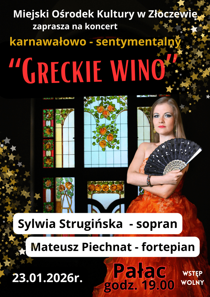 W najbliższy piątek odbędzie się koncert karnawałowo – sentymentalny pt. „Greckie wino”, podczas którego Sylwia Strugińska i Mateusz Piechnat zaprezentują utwory min. z repertuaru Anny German. Koncert odbędzie się w złoczewskim Pałacu w piątek 23 stycznia o godz. 19.00. Wstęp wolny.