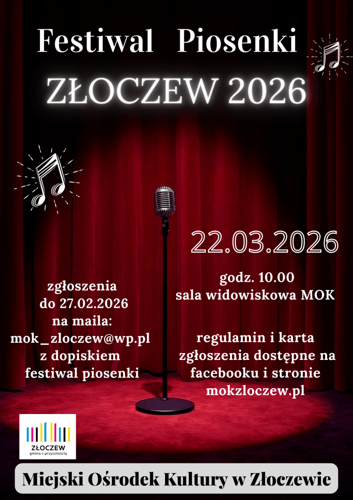 MOK w Złoczewie przygotowuje się również do 32. Festiwalu Piosenki Złoczew 2026, który odbędzie się 22 marca (niedziela). Dzieci i młodzież z szerokiego regionu mogą zaprezentować swoje umiejętności wokalne na złoczewskiej scenie. Szczegóły w regulaminie i karcie uczestnika dostępnych TUTAJ.