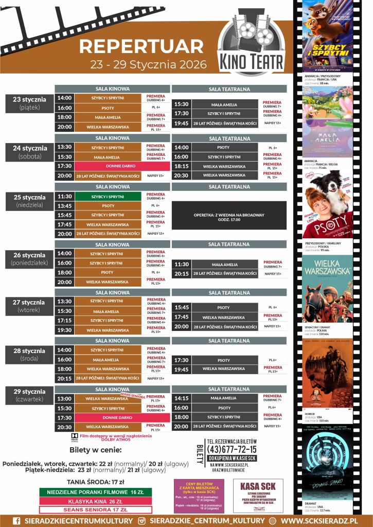Sieradzkie Centrum Kultury zaprezentowało repertuar kinowy KINO-TEATR SCK SIERADZ obowiązujący od 23 do 29 stycznia. Oprócz filmów: „Psoty” i „28 lat później: Świątynia Kości”, będą też dwie premiery – to filmy: „Mała Amelia”, „Szybcy i sprytni” oraz „Wielka warszawska”. W cyklu „Klasyka kina” pokazany zostanie film „Donnie Darko”.