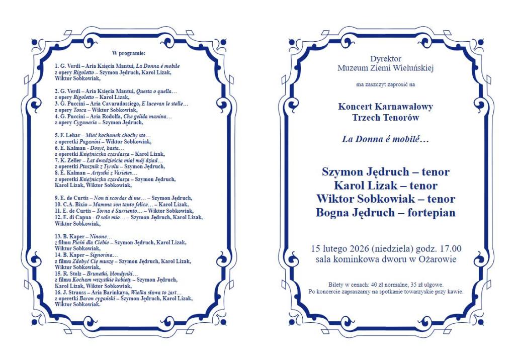 Muzeum Wnętrz Dworskich w Ożarowie Oddział Muzeum Ziemi Wieluńskiej zaprasza na Koncert Karnawałowy Trzech Tenorów „La Donna é mobilé…”, który odbędzie się 15 lutego (niedziela) o godz. 17.00 w sali kominkowej dworu w Ożarowie.