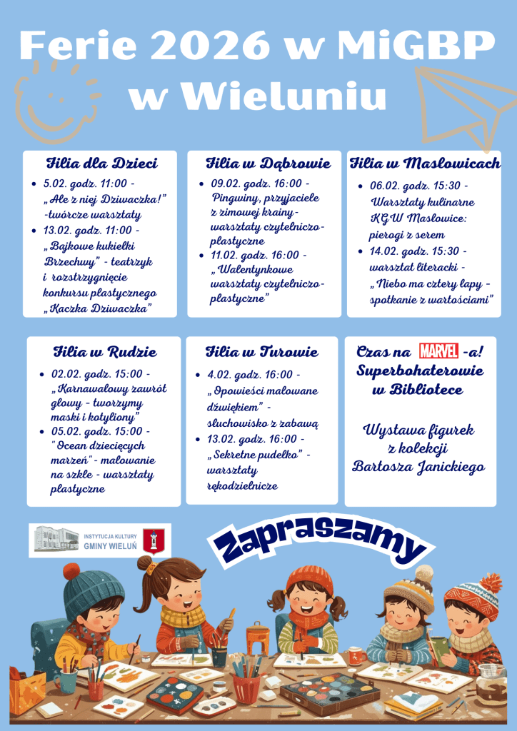 Miejska i Gminna Biblioteka Publiczna przygotowała wiele warsztatów, konkursów i zajęć artystycznych – zarówno w siedzibie biblioteki przy ul. Narutowicza, jak i w filiach w Dąbrowie, Masłowicach, Rudzie i Turowie.