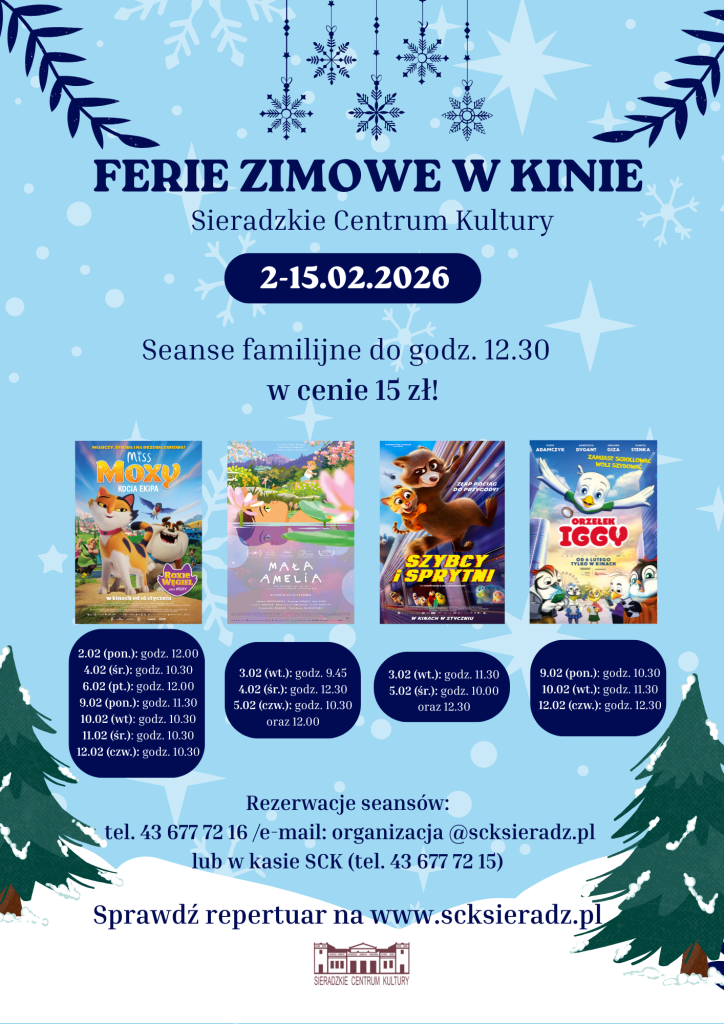 W celu rezerwacji seansów zapraszamy do kontaktu: tel. 43 677 72 16/ e-mail: organizacja@scksieradz.pl lub w kasie SCK tel. 43 677 72 15.