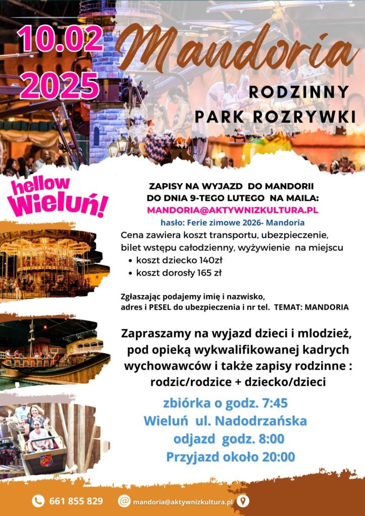 Pierwszy wyjazd odbędzie się 10 lutego do Mandorii – Rodzinnego Parku Rozrywki. To miejsce pełne atrakcji, emocji i rodzinnej atmosfery, w którym dzieci i dorośli mogą wspólnie przeżywać radość i przygodę. W cenie zapewniony jest transport, ubezpieczenie, całodniowy bilet wstępu oraz wyżywienie. Koszt udziału wynosi 140 zł dla dziecka oraz 165 zł dla osoby dorosłej. Zbiórka zaplanowana jest na godzinę 7:45 przy ulicy Nadodrzańskiej w Wieluniu, wyjazd o 8:00, powrót około godziny 20:00. Zapisy trwają do 9 lutego pod adresem mandoria@aktywnizkultura.pl.